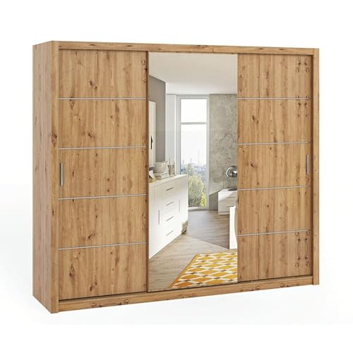 FURNIPOL Bono Sz250 Large Sliding Door Wardrobe with Mirror Premium Bedroom Furniture Storage Solution for Modern Home Interior Artisan Oak