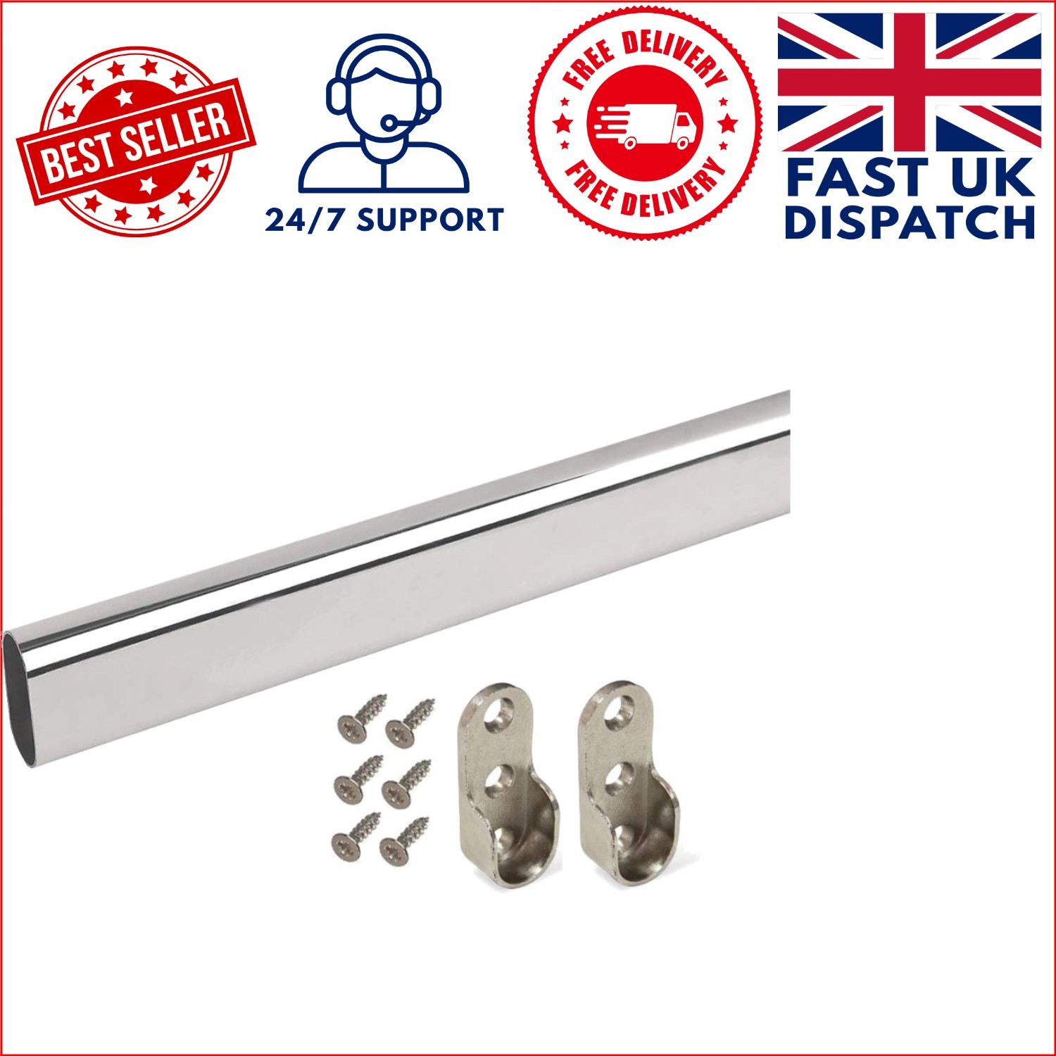 Wardrobe Rail 2x Brackets Kit Chrome Oval 30x15mm Tube Support IANPAV