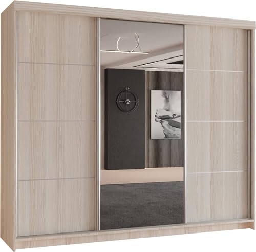 UK SLIDING WARDROBE Modern Full Size Double Mirrors 2&3 Sliding Doors Wardrobe With Adjustable Shelves, Hanging Rails,Bedroom Furniture (Oak, 250cm)