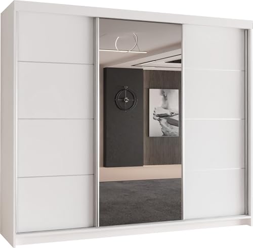 UK SLIDING WARDROBE Modern 2&3 Mirror Sliding Doors Wardrobe With Adjustable Shelves, Hanging Rails,Bedroom Furniture Matt Finish (White, 250cm)