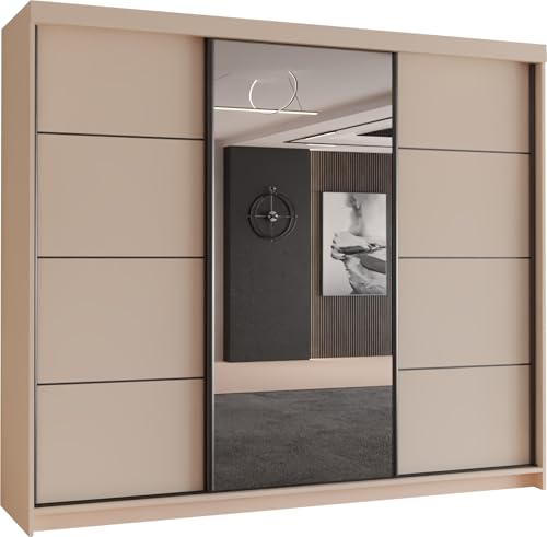 SLIDING WARDROBE 4U Prestige 250cm Triple Door Sliding Wardrobe with Shelves, Drawers & Hanging Rails, Space Saving Bedroom Storage, White, Oak Sonoma, Cashmere & Artisan (Cashmere, 250cm)