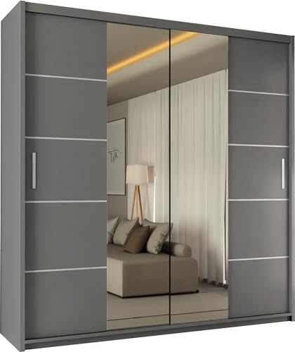 UK SLIDING WARDROBE Modern 2&3 Mirror Sliding Doors Wardrobe With Adjustable Shelves, Hanging Rails,Bedroom Furniture Matt Finish (Grey, 203cm)