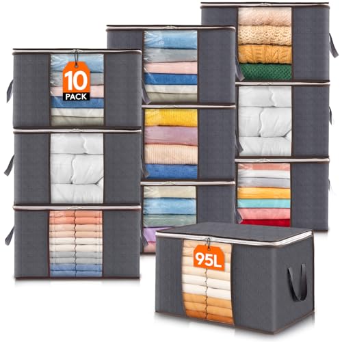 Lifewit 95L Clothes Storage Bags, Foldable Storage Box Moving Bags Wardrobe Storage Organiser Packing Boxes for Moving House with Clear Window for Clothing Bedding Blankets, Grey, 10 Pack