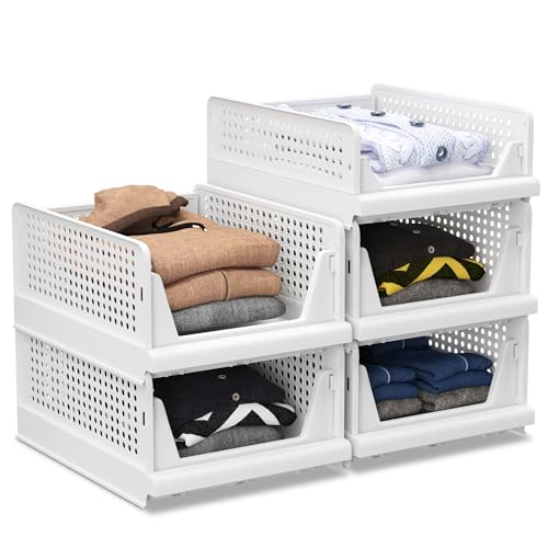 AUTOFU Wardrobe Storage Organiser, 4 Pack Folding Closet Organisers, PP Plastic Stackable Storage Boxes for Shelves, Easy Pull Out Drawer Organizer Basket for Home, Bedroom, Kitchen, White (Set of 4)