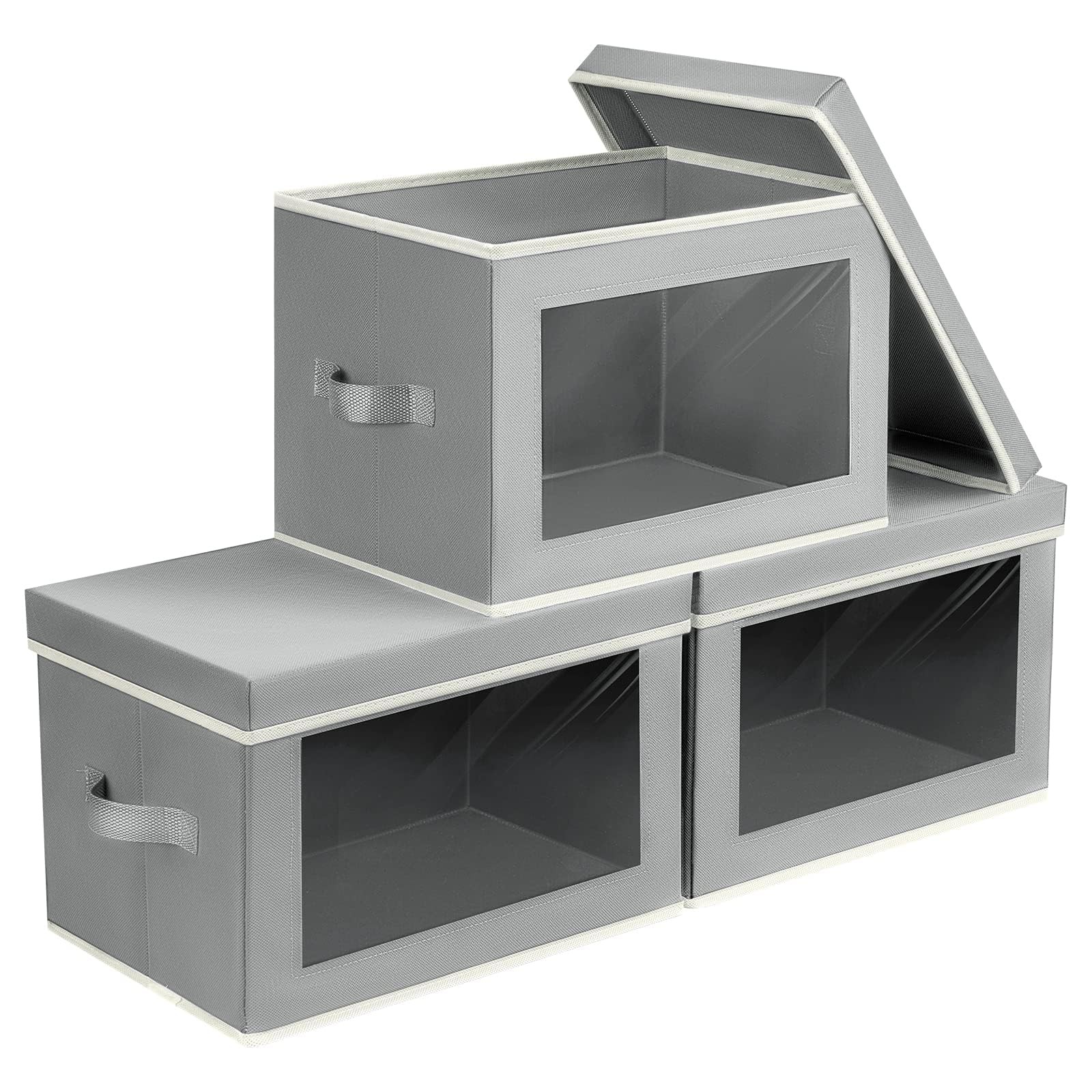 Homsorout Wardrobe Storage Boxes with Lids - 3 Pack Foldable Front Opening Bins Clothes Organiser with Handles, Fabric Storage Basket Decorative Containers for Shelf, Bedroom, Office, Dorm - Grey