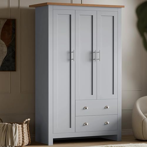 Blisswood 3 Door Wardrobe with 2 Drawers & Hanging Rail – Grey Bedroom Wardrobe with 5 Shelves, Wooden Clothes Storage Cupboard Unit, Triple Wardrobe for Bedroom Furniture
