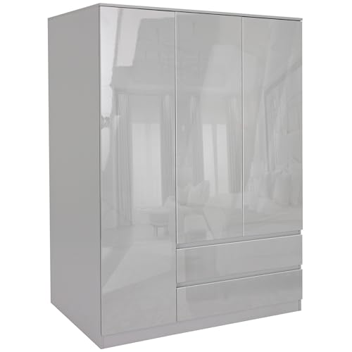 Blisswood 3 Door Grey Wardrobe with 2 Drawer Storage & Hanging Rails - Engineered Wood Triple Wardrobe for Bedroom Organiser with Shelves - High Gloss Ward robe Cabinet - Cupboard - Bedroom Furniture