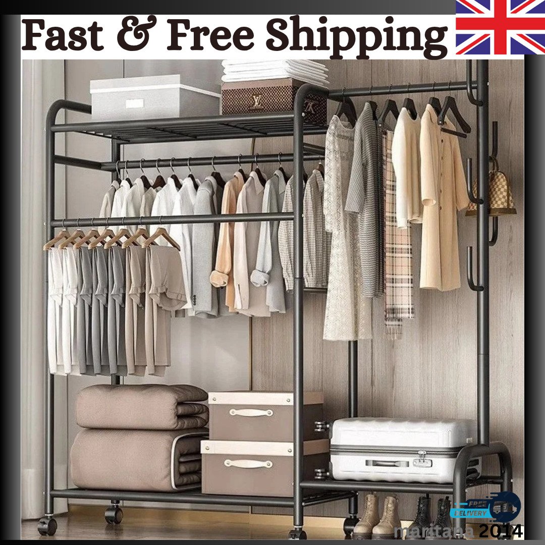 Heavy Duty Double Clothes Rail Rack Garment Hanging Stand Open Wardrobe Shelf UK