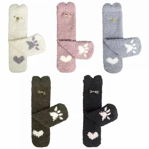 sanjianke-fs 5 Pairs Cat Cotton Sock Slippers for Women, Animal Non-Slip Bed Microfiber Winter Warm Cute Fluffy Socks for Women Girls