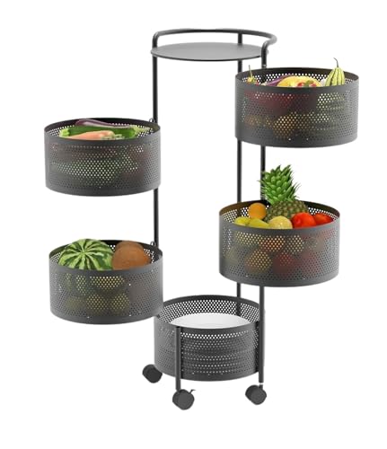 Movable Kitchen Shelves Rotating Fruit Basket, Metal Sturdy Kitchen Storage Rack Shelf Carts No Assembly On Rolling Wheels For Fruit Vegetable Efficient utilization of space(5-tierBlack-upgrade)