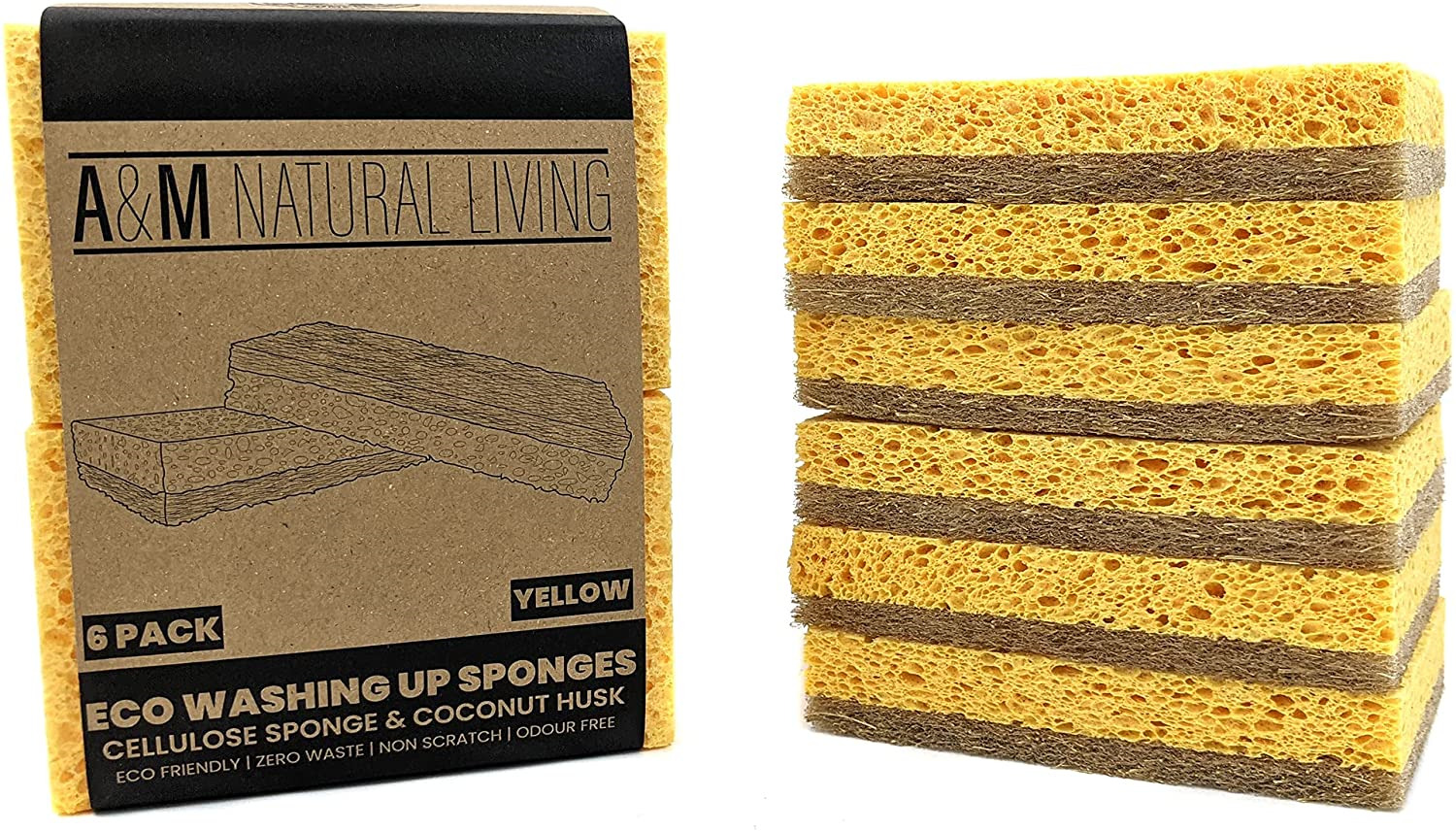 A&M Natural Living Eco Washing Up Sponge Pack of 6 Yellow, Eco Friendly Sponge