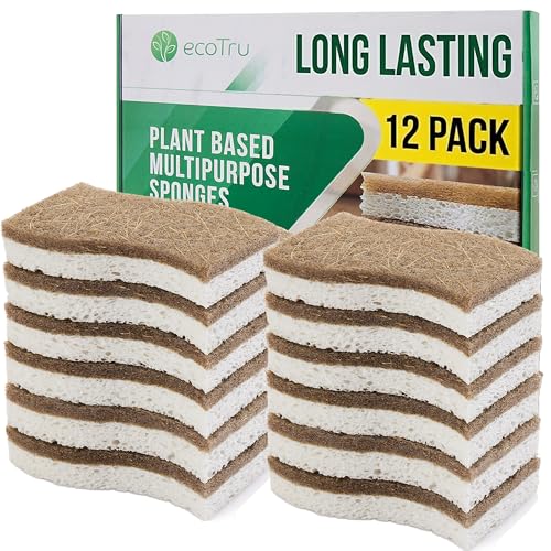 12 Pack Natural Washing Up Sponge, UK Brand Eco Friendly Kitchen Dish Cleaning Sponges, Compostable Cellulose & Coconut Eco Sponges & Scourers, Biodegradable Non Scratch for Heavy Duty Scrubbing