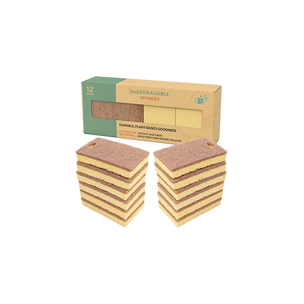bioGo 12 Biodegradable Washing up Sponge | Compostable Kitchen Dish Sponges | Cellulose Eco Dish Sponge Scourer | Sponges Washing Up | Washing Up