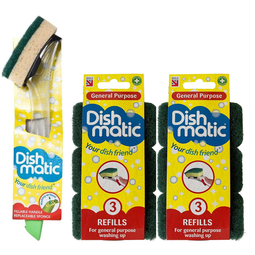 Dishmatic Fillable Washing up Brush and Sponge - Easy Grip Dish Cleaner +1 Bonus Refill - with 6X Dishmatic General