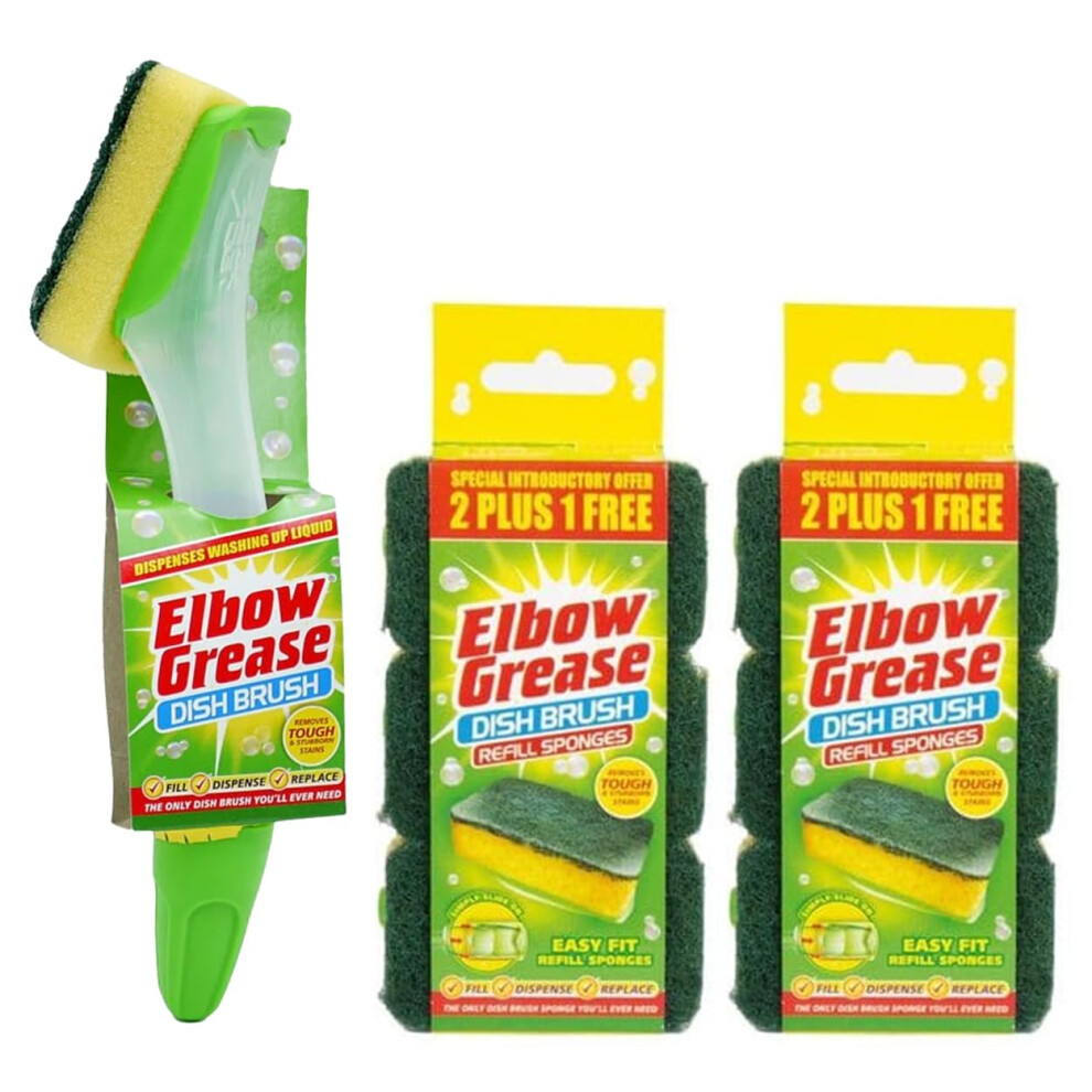 Elbow Grease Fillable Washing Up Brush with Sponge- Ergonomic design handle - with 6X Elbow Grease Sponge Refills