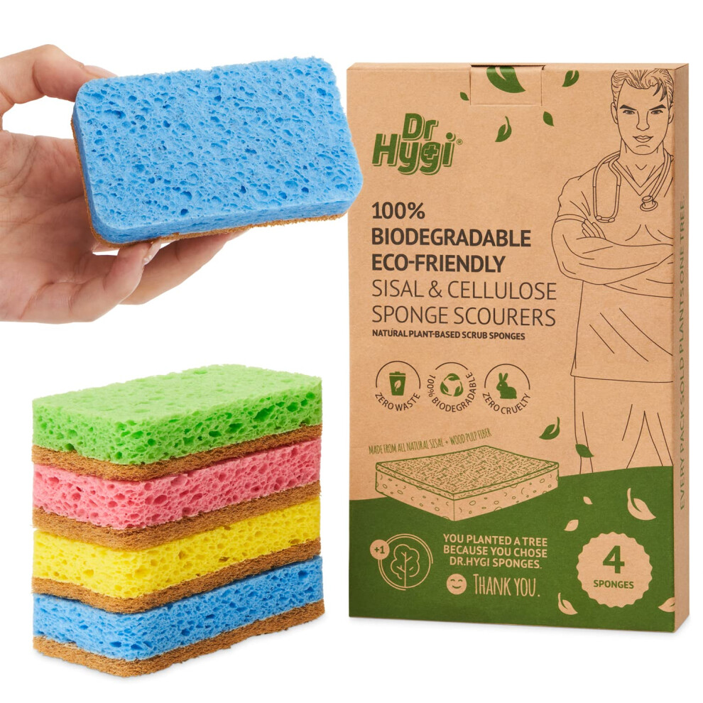 Dr.Hygi Scrub Sponges - 4-Pack Eco Sponges Set - Natural Sisal and Cellulose Washing Up Sponge - 100% Biodegradable, Zero Waste Bathroom, Kitchen
