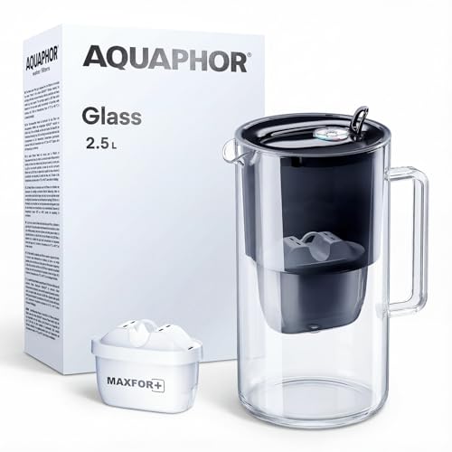 AQUAPHOR Glass Black Water Filter Jug - Take to Table Premium Glass Design Jug with Easy-Fill Flip-Open Lid, 2.5L Capacity, 1 X MAXFOR+ Filter