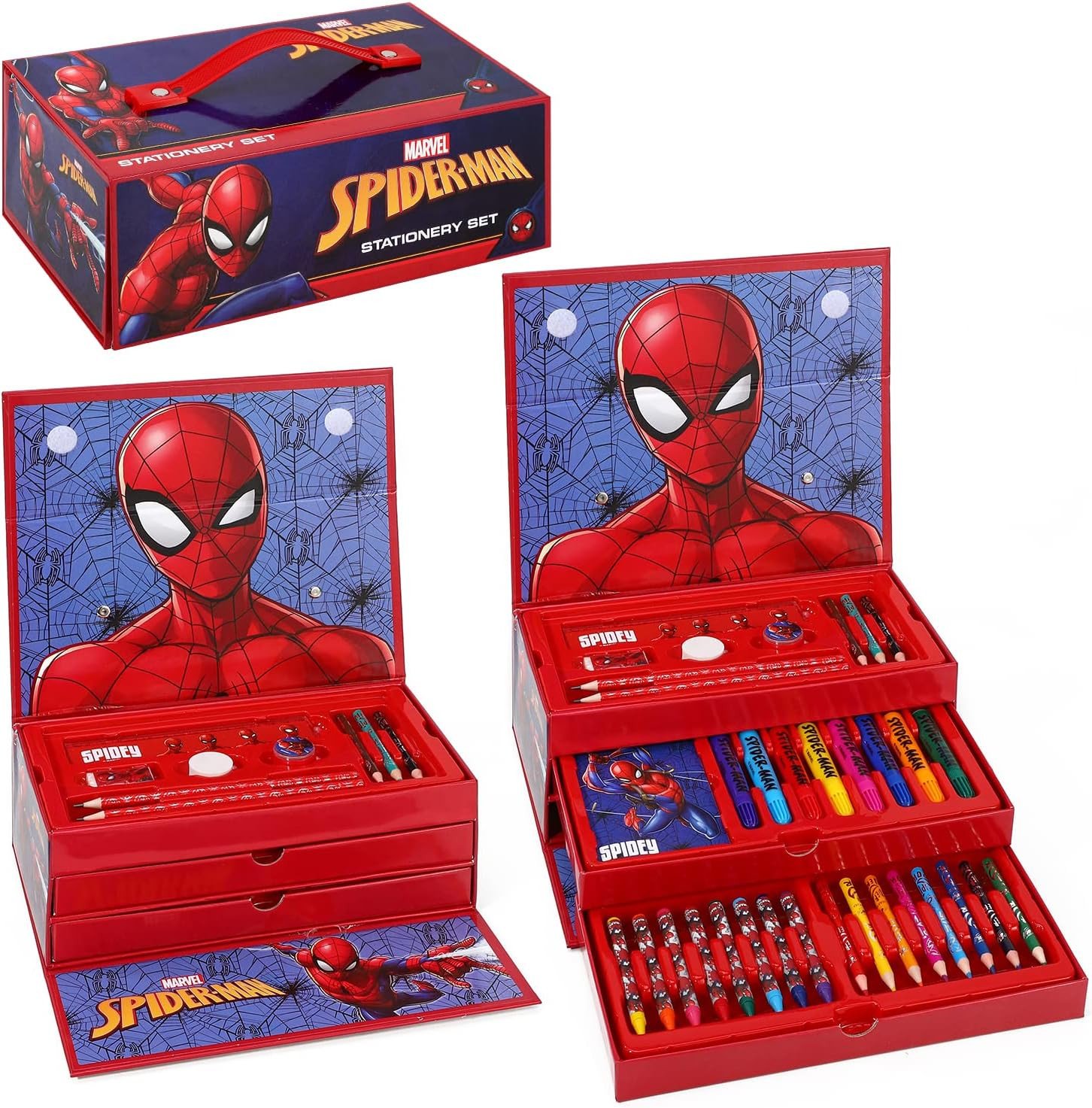 Spiderman Kids 34pc Colouring Art Stationery Set with Watercolour Felt Tip Pens Crayons and Pencils Travel Set for Children