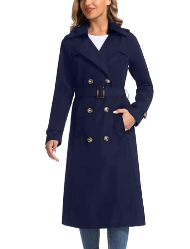 poonyfesh Women's Waterproof Long Trench Coat Double Breasted Length Classic Lapel Belt Coat With Removable Hood, Navy, S