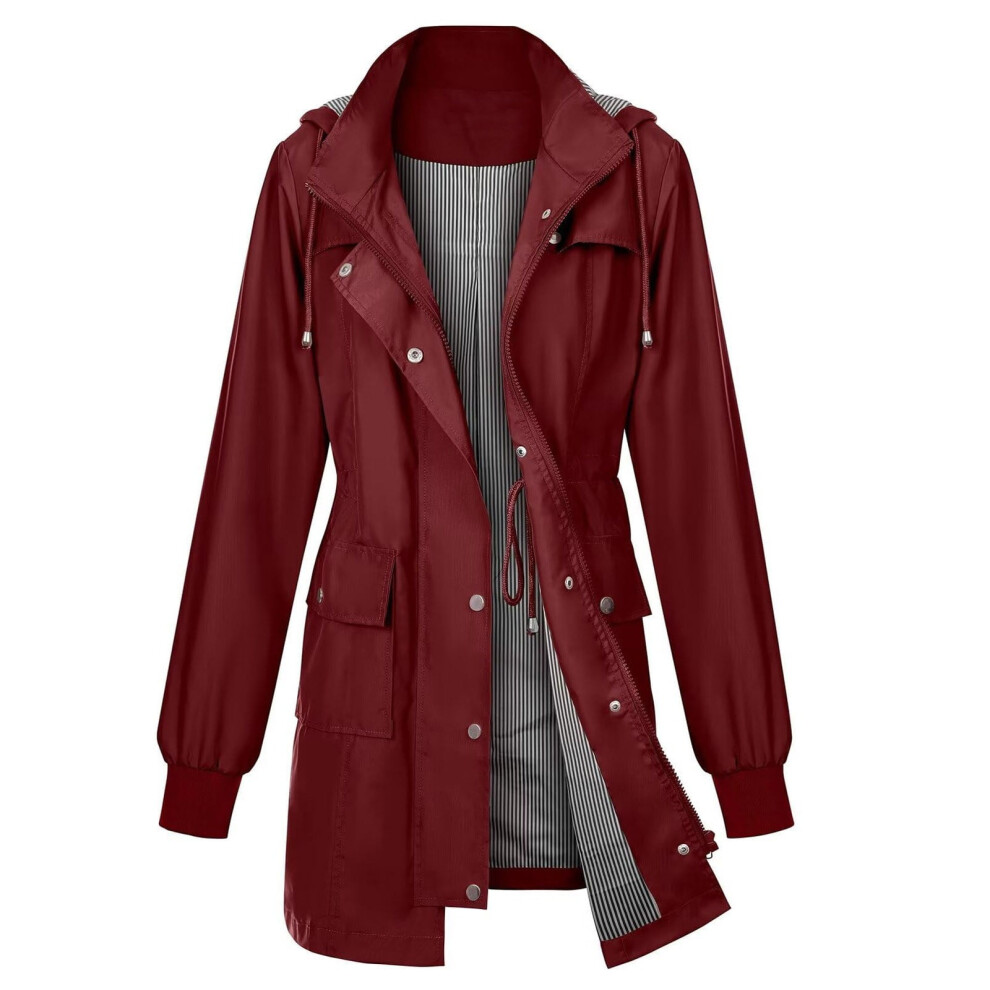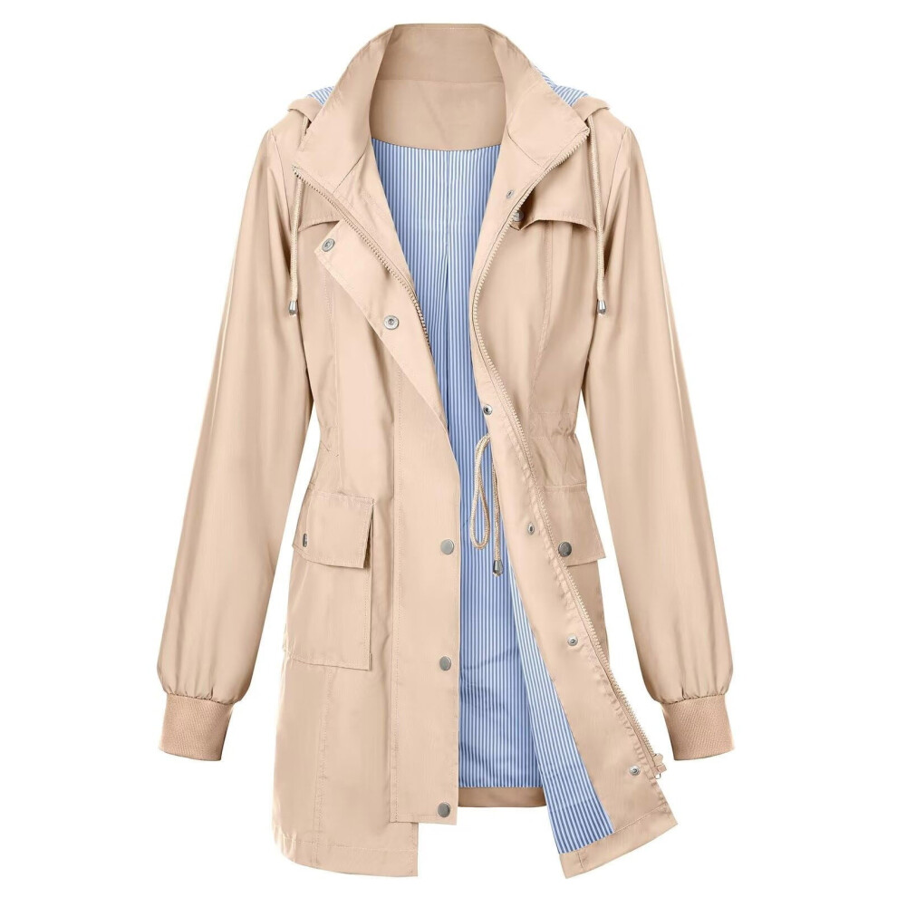 Trench Coat For Women Waterproof With Detachable Hood Solid Color Elastic Waist Zipper Long Jacket With Drawstring Versatile Coat