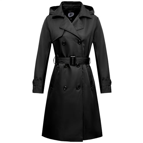 Tuopuda Women's Waterproof Trench Coat Double-Breasted Classic Lapel Overcoat Belted Slim Fit Jackets Outerwear Coat with Detachable Hood(Black,XL)