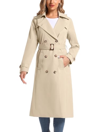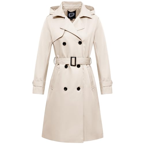 Garemcy Women's Long Waterproof Trench Coat Double Breasted Classic Lapel Coat Belted with Detachable Hood, Beige, M