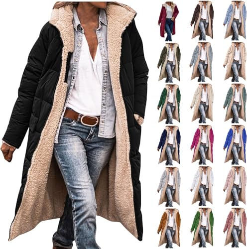 Womens Coats Long Winter Coats for Women Uk Waterproof Fleece Faux Fur Lined Quilted Ladies Parka Puffer Jackets with Hood Warm Plus Size Fashion Hooded Trench Coat Clothes Black L