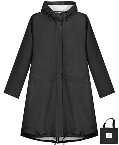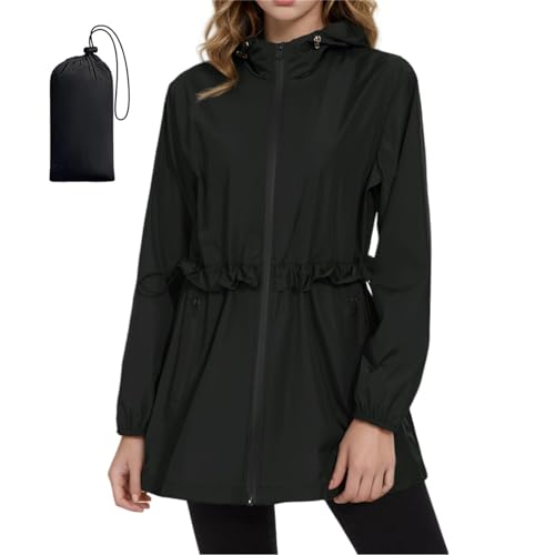 ANYOO Women Waterproof Raincoat Rain Jacket with Hood, Lightweight Long Rain Coat Windbreaker Trench, Black, One Size