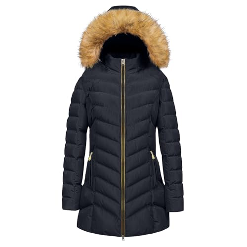 Women's Down Jacket Winter Mid-lenght Down Puffer Coats Ladies Lightweight Waterproof Jackets with Fur Hood Plus Size Slim Trench Coat Long Sleeve Warm Outwear Outdoor Hiking Jackets UK Size 10-18