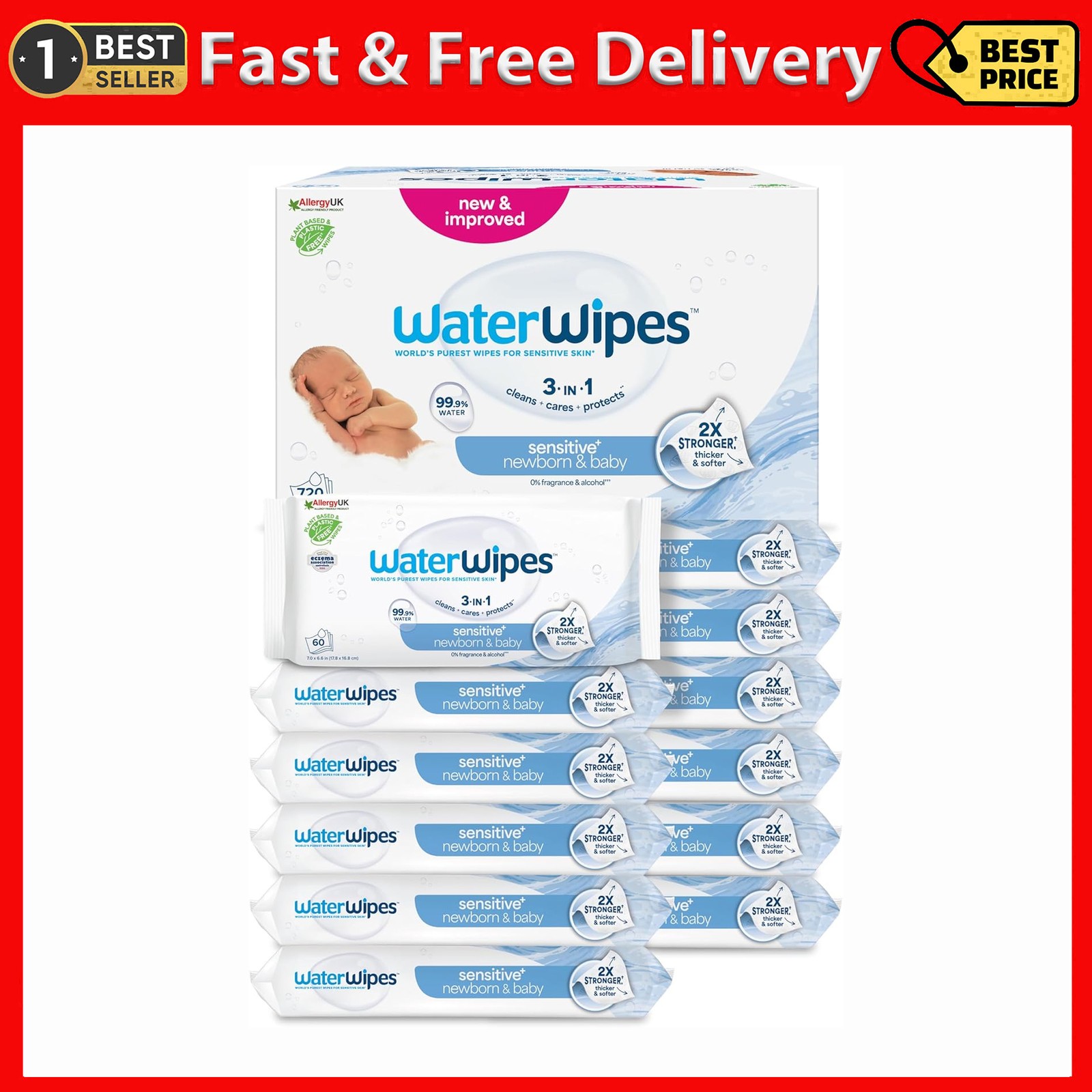 WaterWipes Sensitive+ Newborn & Baby Wipes, 720 Count (12 Packs), 3-In-1 Cleans, Cares, Protects, 99.9% Water, Unscented