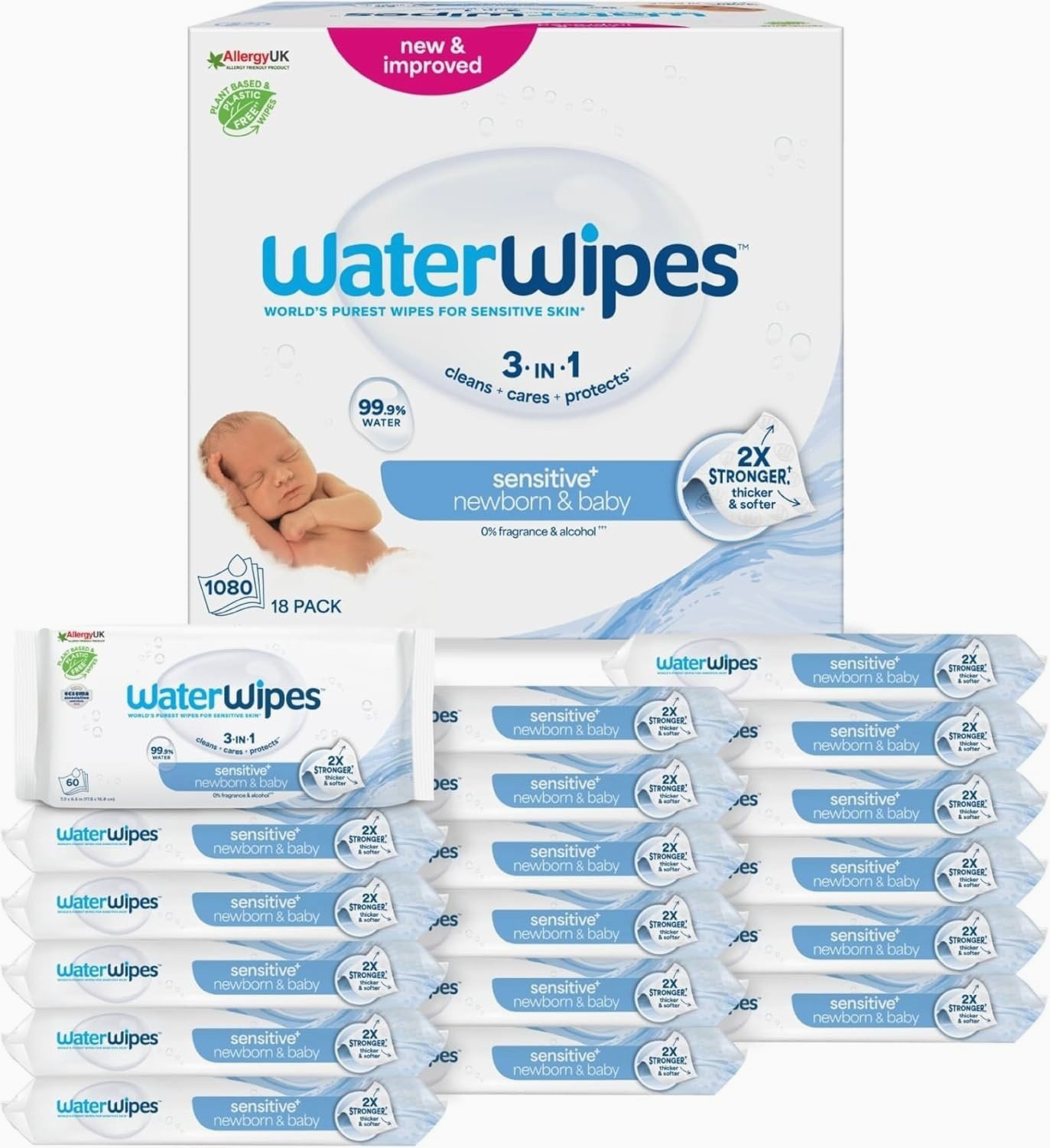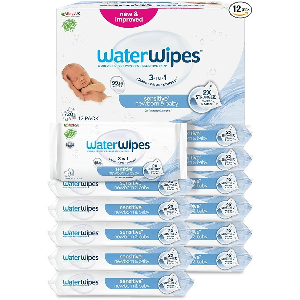 Waterwipes Sensitive+ Newborn & Baby Wipes, 720 Count (12 Packs), 3-In-1 Cleans,