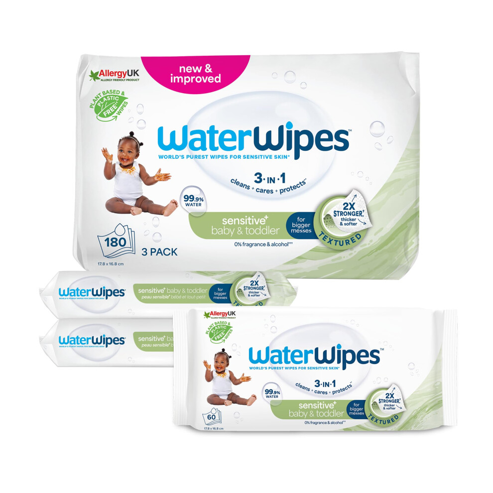 WaterWipes Sensitive+ Baby & Toddler Wipes, 180 Count (3 Packs), 3-In-1 Cleans, Cares, Protects, 99.9% Water, Textured Clean, Unscented