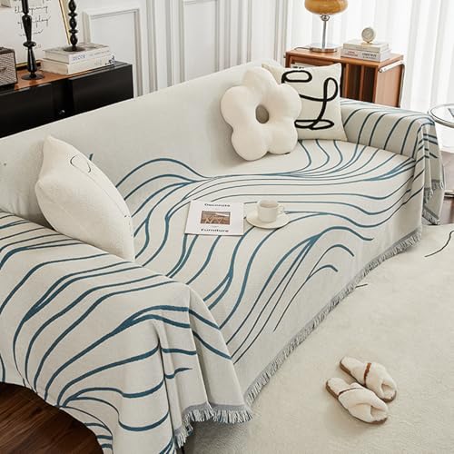ZCXRYFL Throws For Sofas Large A/B reversible Sofa Blanket L/U Shape Chenille Couch Throw Cover 1 2 3 4 Seater Sofa Slipcovers Multipurpose Blankets For Settees Bed, Wave lines(180X260cm,Blue)