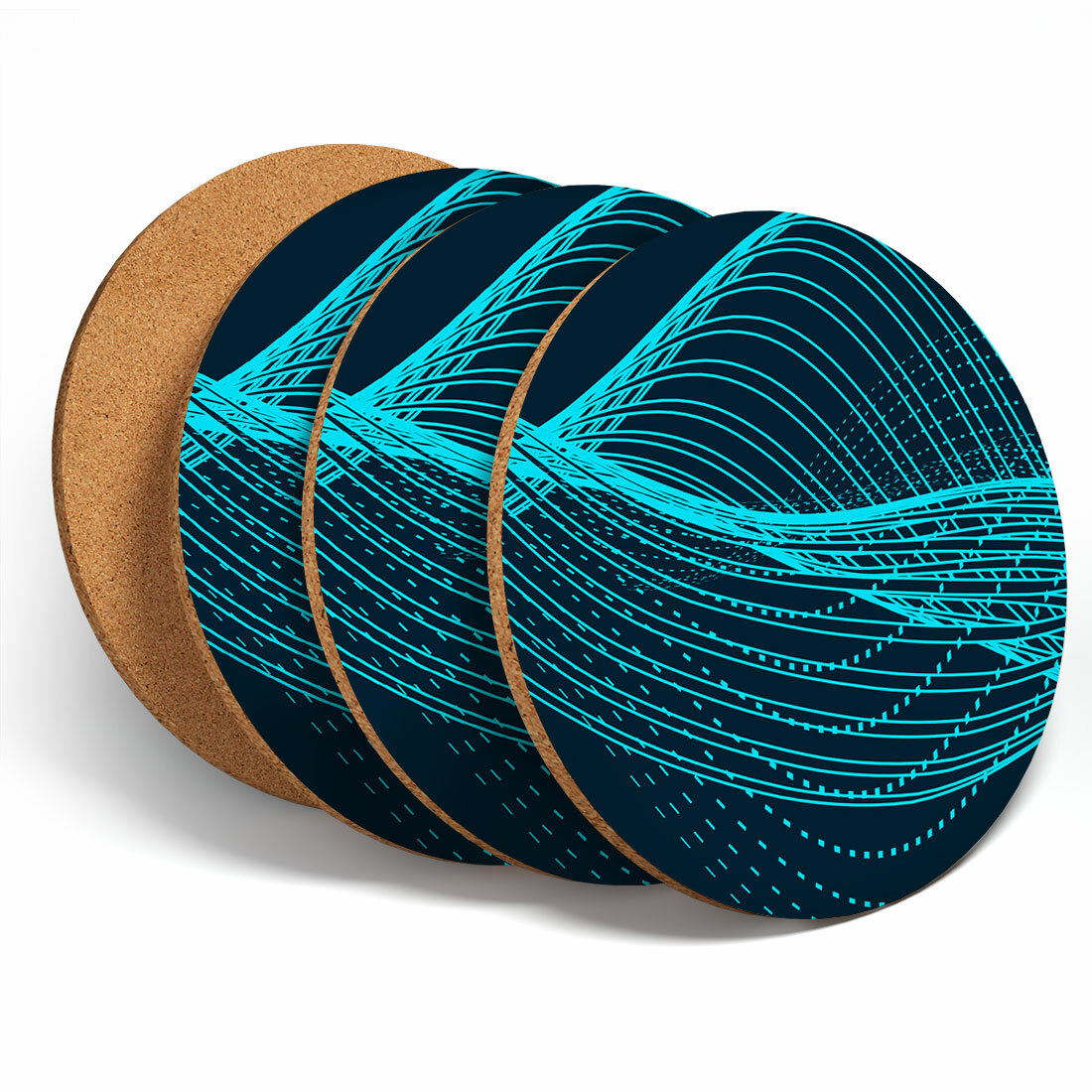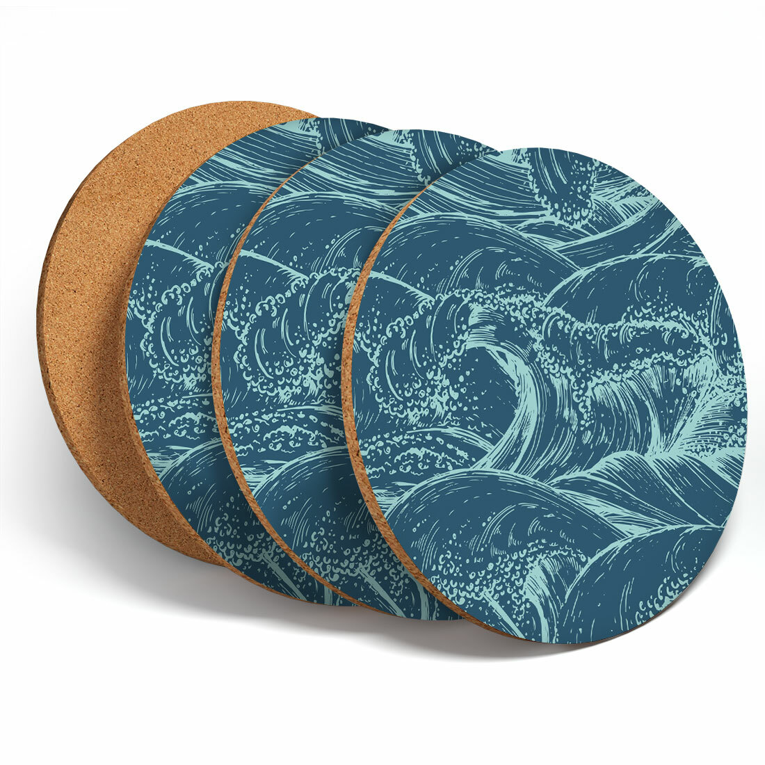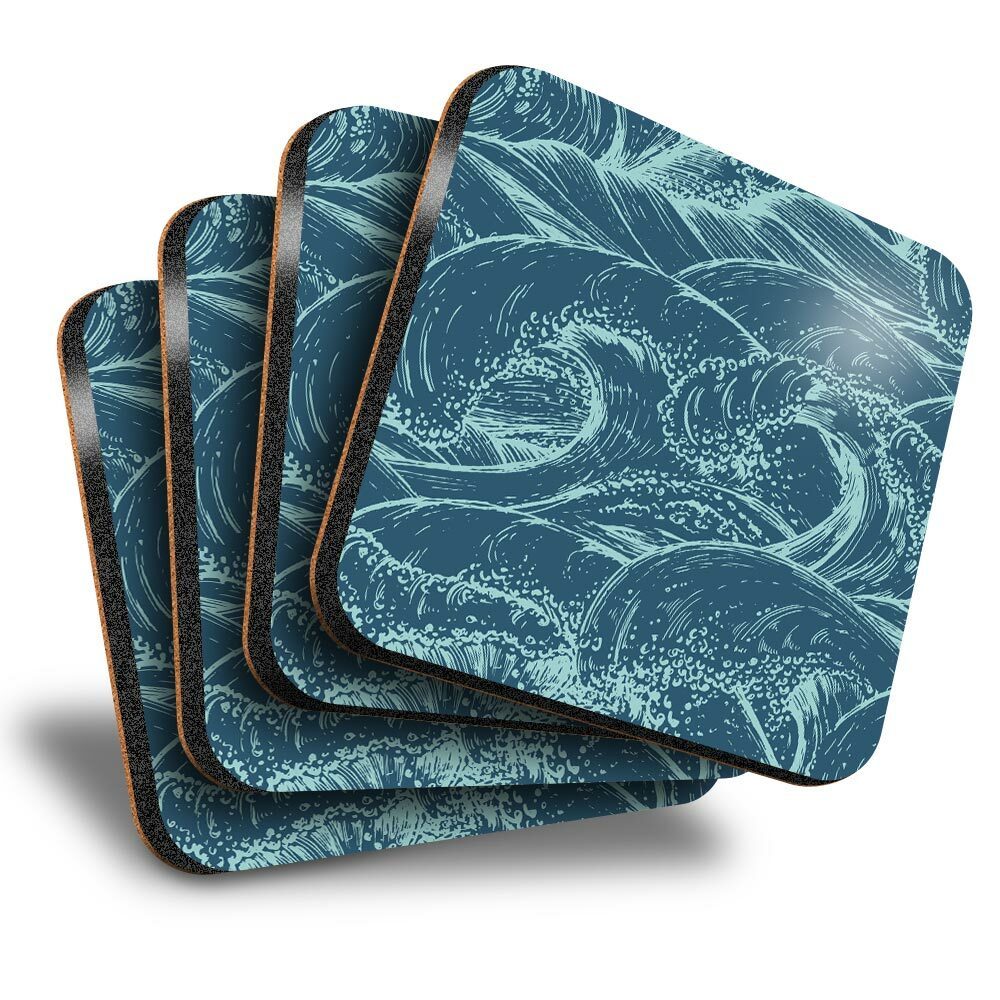 4 Set - Blue Surf Wave Illustration Coasters - Kitchen Drinks Coaster Gift #3896