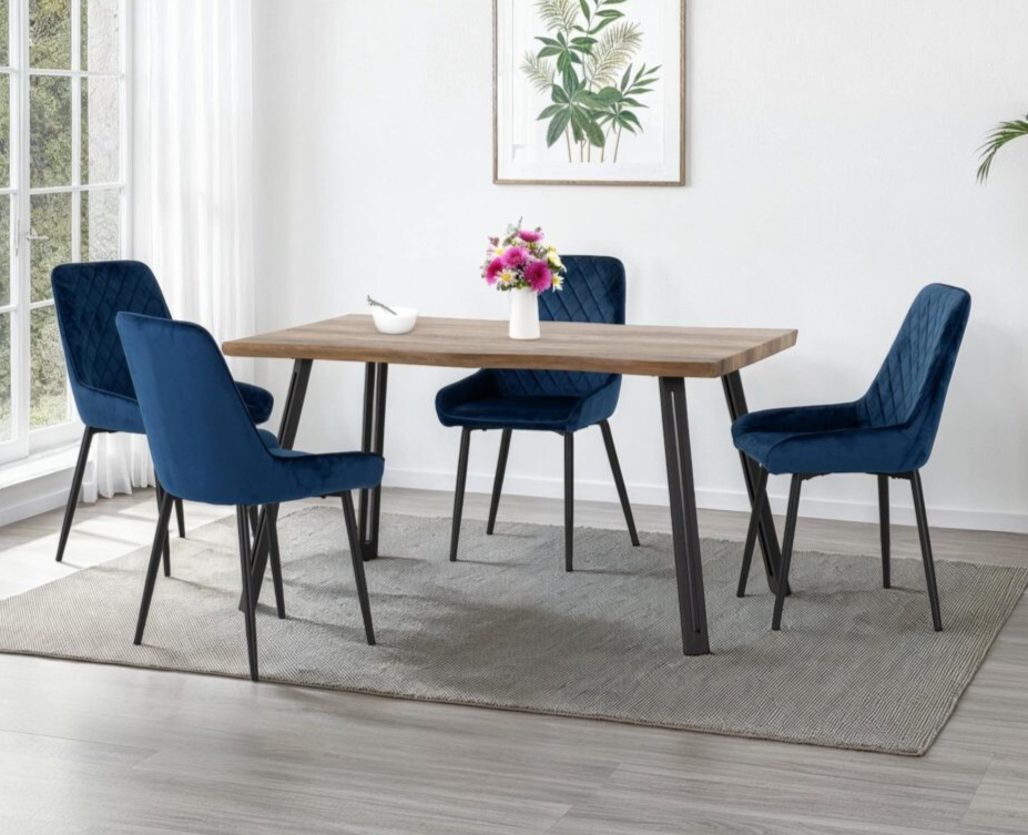 Seconique Quebec Wave Dining Table Set with 4 Lukas Dining Chairs in Medium Oak Effect/Sapphire Blue Velvet