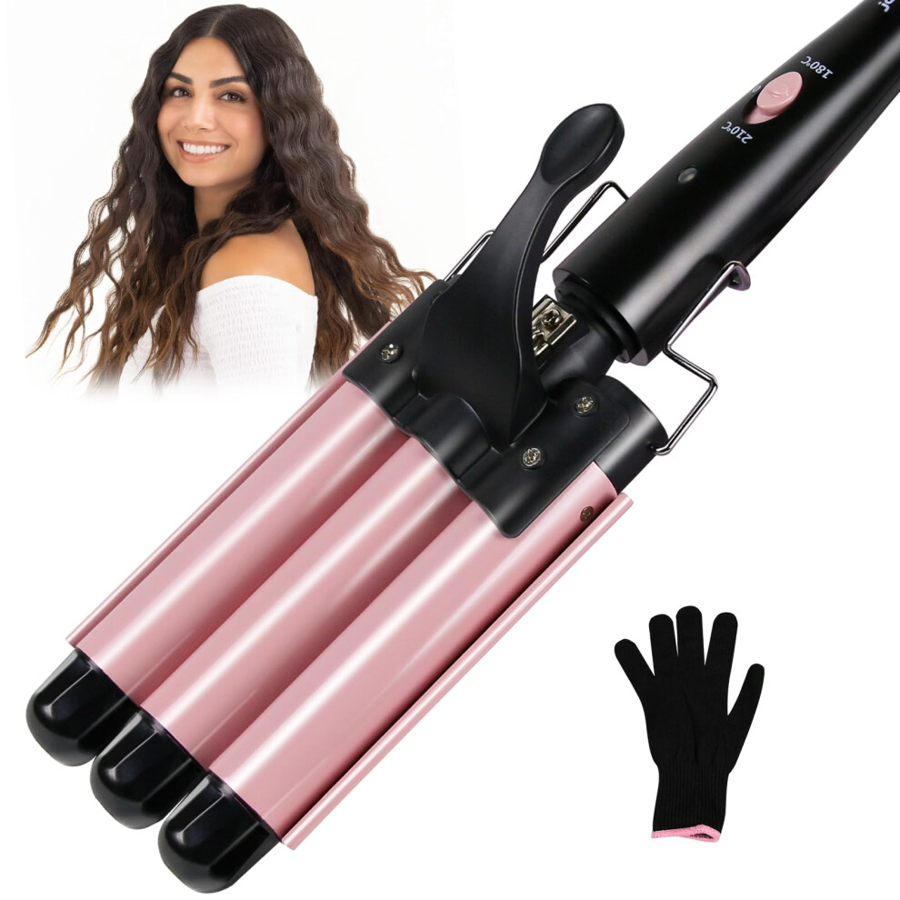 3 Barrel Hair Waver 25mm Beach Wave Hair Curler with 2 Temperature Adjustments, Ceramic Curling Iron with Heat-Resistant Glove for Long Medium Short