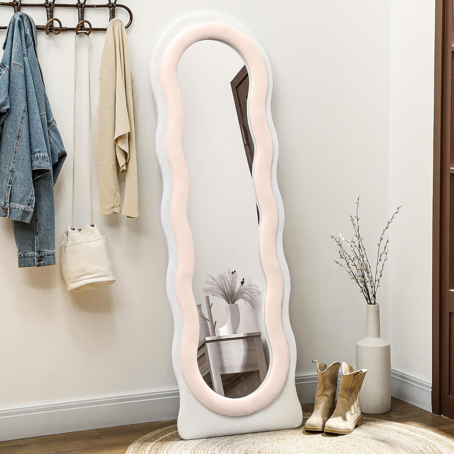 LunaMirror Full Length Mirror 160x60 CM Wavy Full Body Wall Mounted Floor Mirror with Stand Ivory Flannel Frame Leaning Hanging Wall for Bedroom Entrance