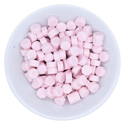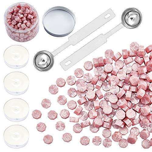 CRASPIRE 300 Pieces Octagon Sealing Wax Beads Sticks with 4 Pieces Tea Candles and 2 Piece Wax Melting Spoon for Wax Stamp Sealing (Pearl Pink)
