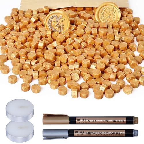 WEWINK PLUS 304PCS Wax Seal Beads Set, 300PCS Gold Sealing Wax Beads with 2Pcs Tea Candles and 2Pcs Metallic Pen for Invitations, Envelope, Crafts, Stamp Seals, Decoration, Letter, Gift