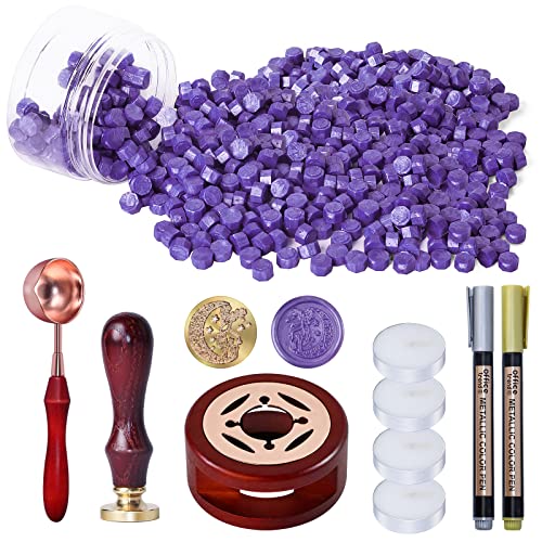 250 PCS Wax Seal Stamp Kit, WEWINK PLUS Purple Sealing Wax Beads with Deer Stamp, Warmer, Spoon, Tea Candles, Metallic Pen for Stamp Seals, Gifts, Invitations, Envelopes, Craft
