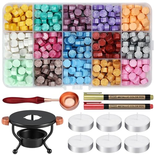 310Pcs Wax Seal Kit, WEWINK PLUS Sealing Wax Beads Set with Warmer, Melting Spoon, 6Pcs Candles,2Pcs Metallic Pens for Vintage Envelopes Letters Crafts, Decoration, 15 Colors