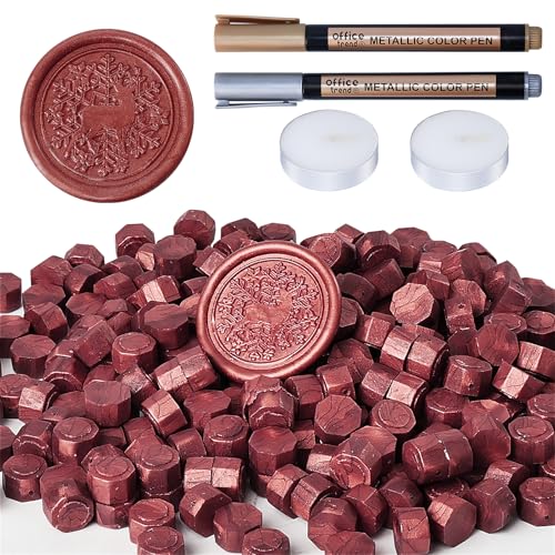 WEWINK PLUS 304PCS Wax Seal Beads Set, 300PCS Wine Red Sealing Wax Beads with 2Pcs Tea Candles and 2Pcs Metallic Pen for Invitations, Envelope, Crafts, Stamp Seals, Decoration, Letter, Gift