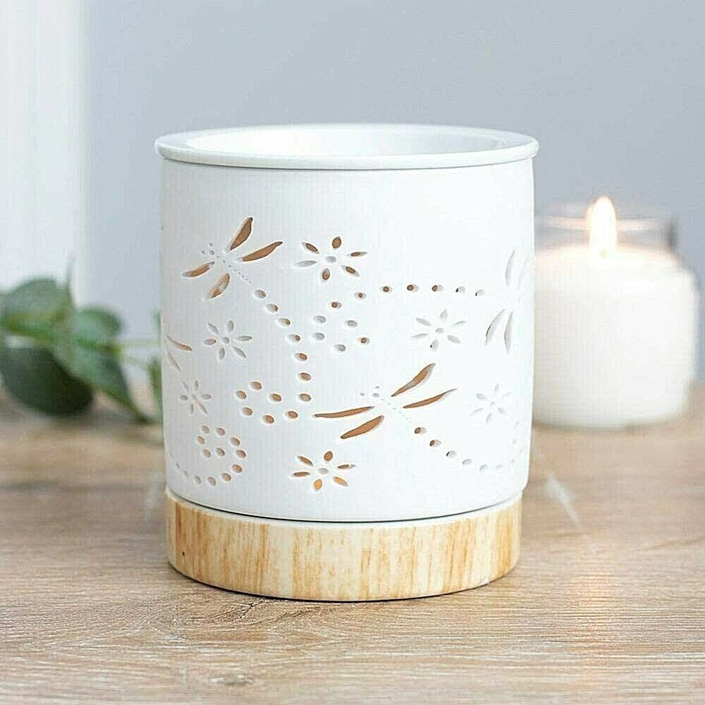 White Ceramic Oil Burner Dragonfly Design Tealight Holder Wax Melt Gift Boxed