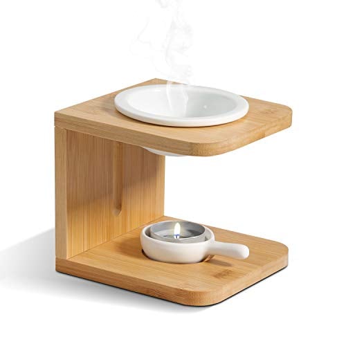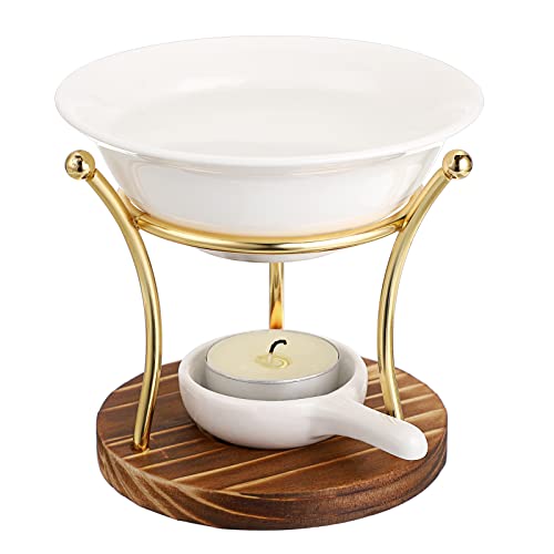 BSTKEY Metal Wooden Wax Melt Burner Essential Oil Burner with Ceramic Bowl, Decorative Aroma Diffuser Wax Burner Tealight Candle Holder Burner
