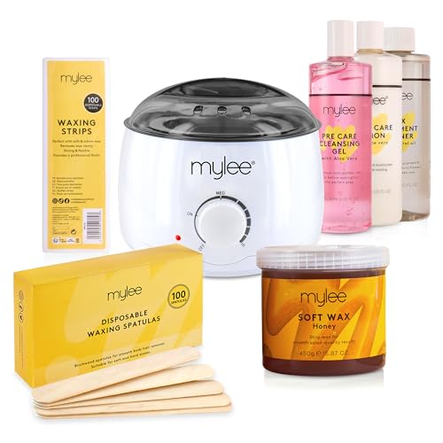 Mylee Salon Quality Waxing Kit Includes Wax Heater, Soft Honey Wax, Waxing Strips, Spatulas, Mylee Pre and After Care Lotion and Equipment Cleaner (Soft Honey Wax Kit)