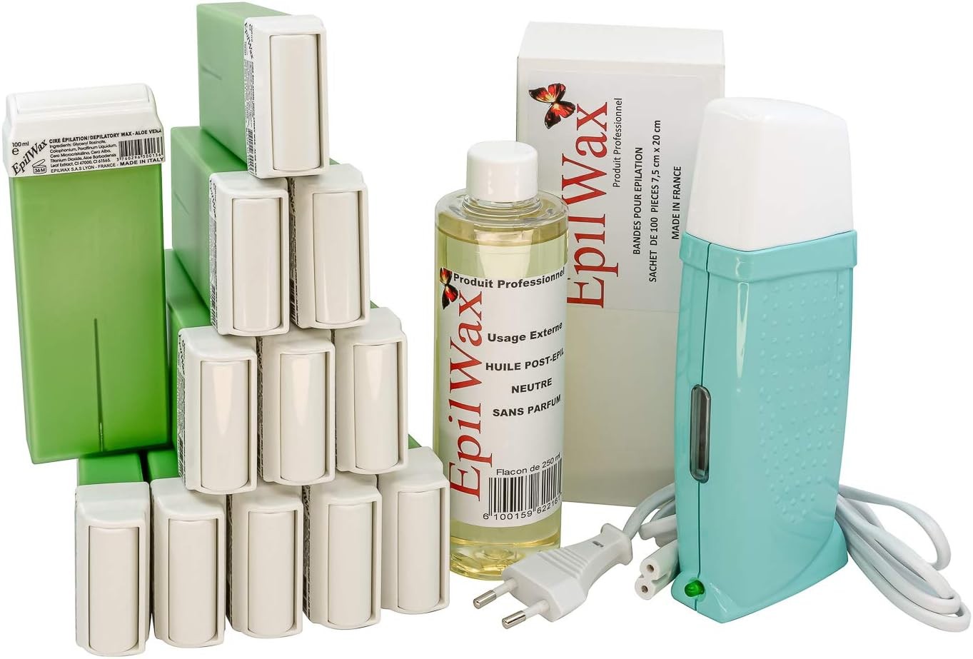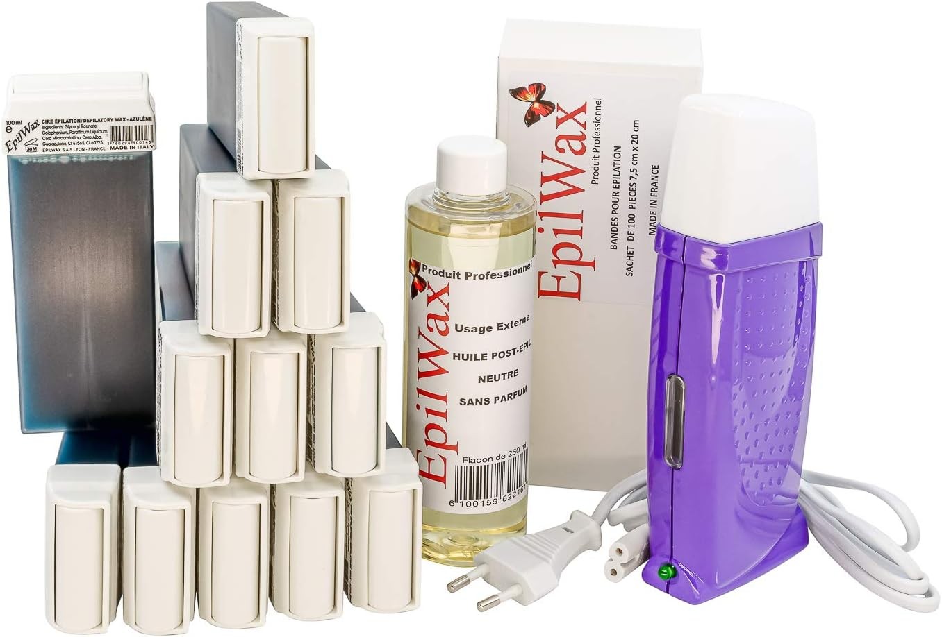 EpilWax Complete Hair Removal Waxing Kit - With 12 Azulene Wax Roll-on Cartridges, Roll On Wax Heater, 100 Strips and Waxing Oil