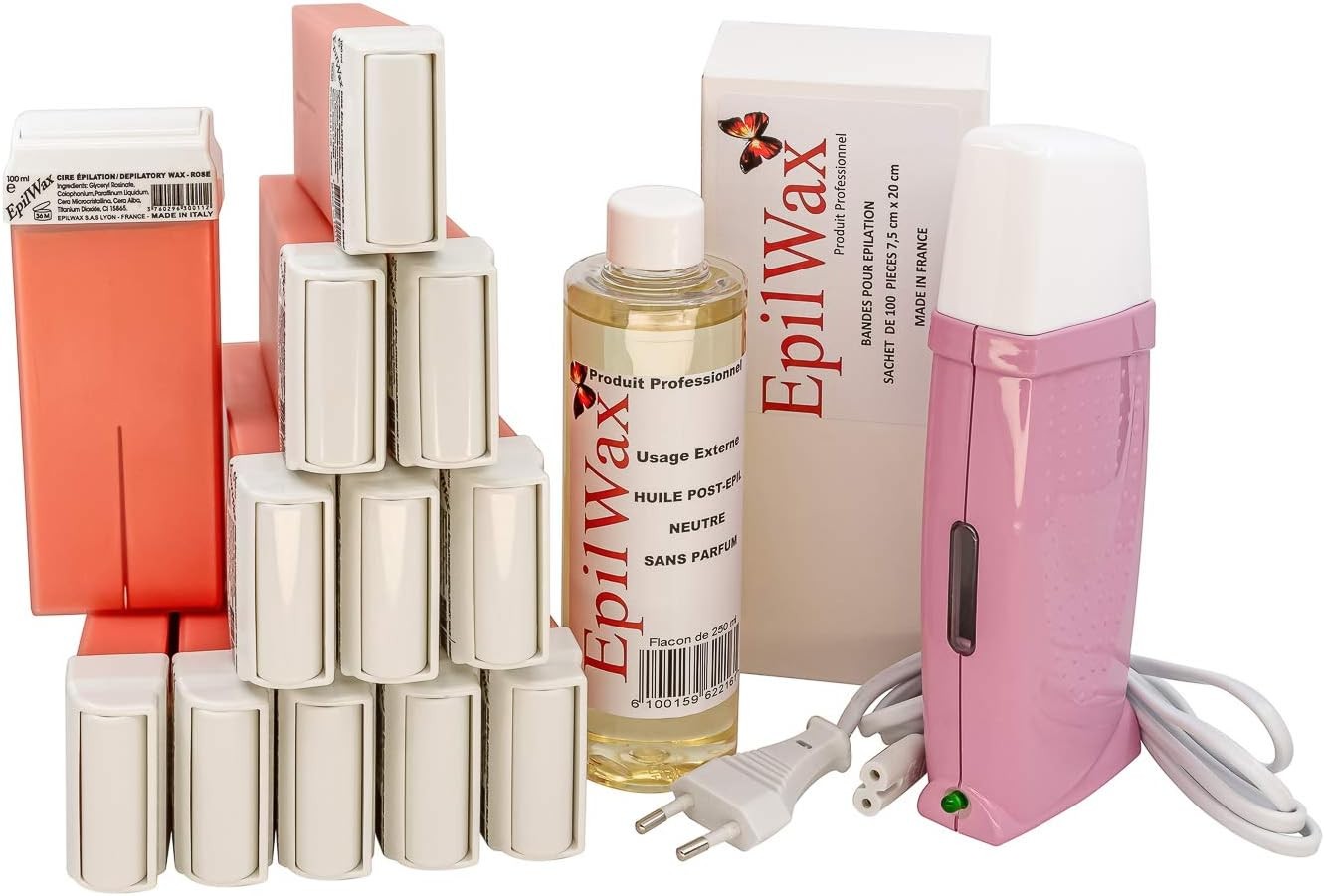 EpilWax Royal Depilatory Kit Complete with: Professional Wax Heater 4 Roll-On Wax 100 ml Pink, 100 Depilatory Strips, 1 Bottle of 250 ml After Wax Oil - (Royal Series Pink 4)