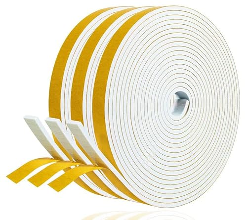 ASelected 12 Meters 4 Pack Foam Draught Excluder Tape for Door and Window Self Adhesive Foam Tape EPDM Rubber Tape for Sound Proofing Weather Strip Draft Sealing Strip, White - 9mm x 2mm x 3 Meters