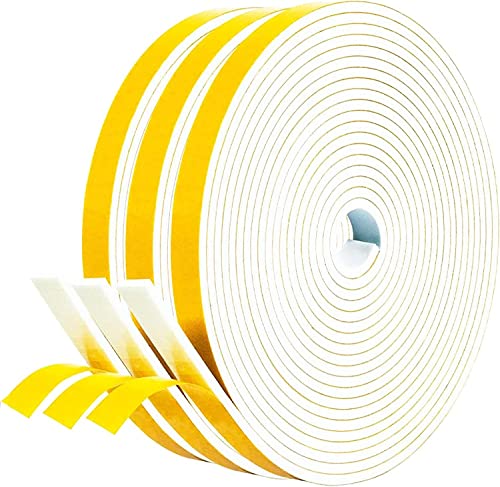 Draft Excluder Foam Seal Tape, 12mm(W) x 3mm(T) High Density Adhesive Foam Weather Strip Seal for Window and Door, 3 Rolls, Total 15M Long White