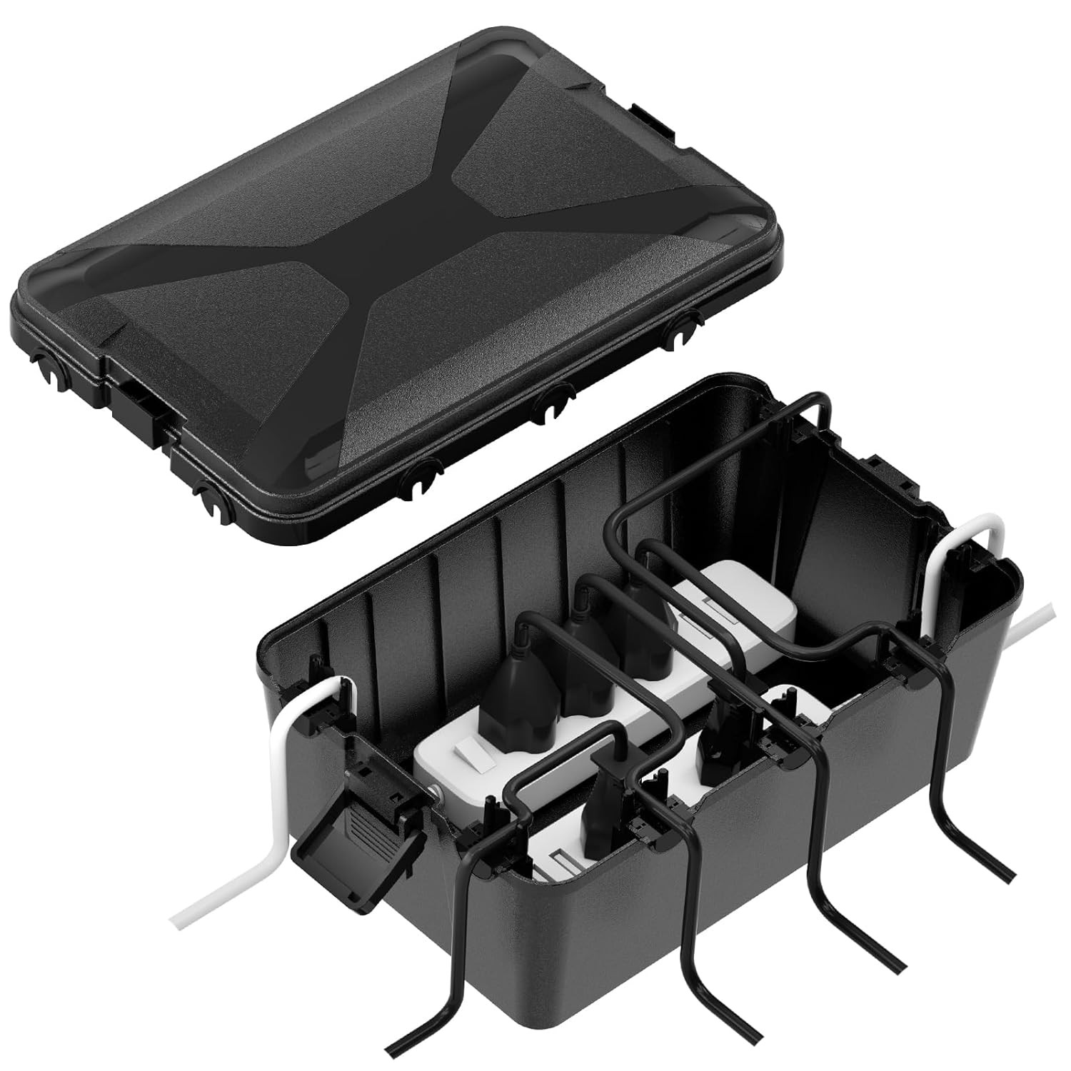 RESTMO Outdoor Waterproof Box (29 × 13.2 × 10cm), IP54 Weatherproof Electrical Box for Multi Plug Extension Lead, Protect Outlet, Plug, Christmas String Lights from Water, Snow, Dust, Black